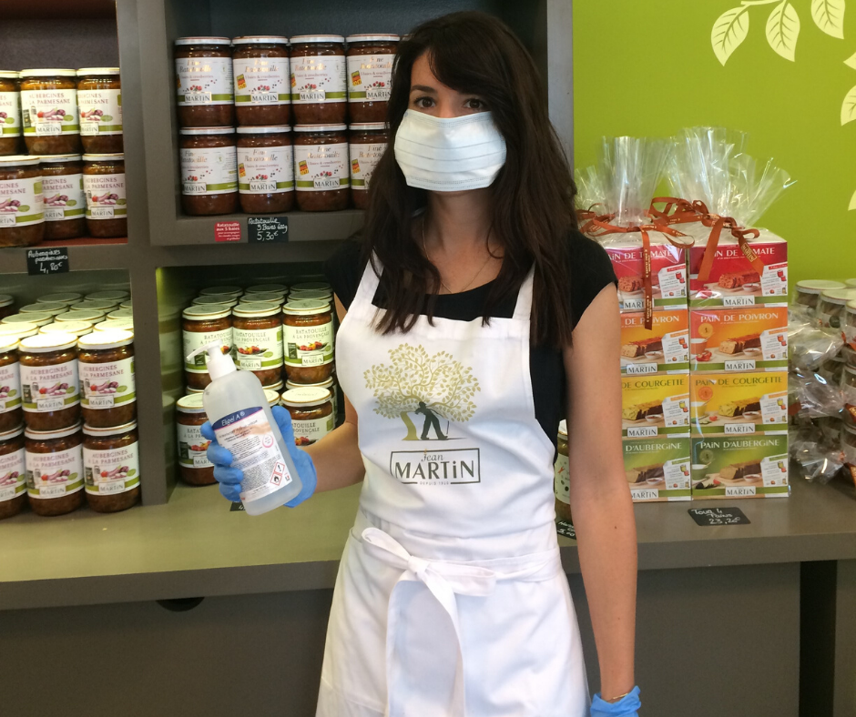 - Mise à disposition de gel hydroalcoolique en début et en fin de parcours = à l’entrée et en caisse